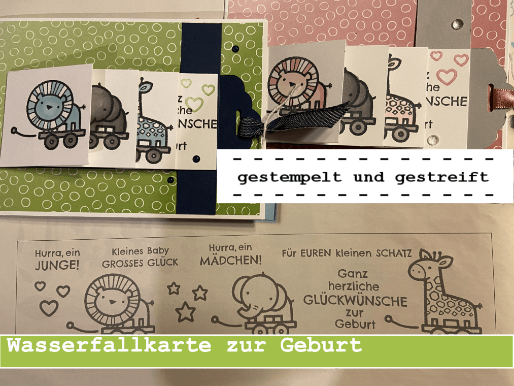 Um diesem Boom gewappnet zu sein, habe ich ein paar Glückwunschkarten zur Geburt gebastelt. Im Minikatalog gibt es das tolle Set "Verspieltes zur Geburt", das ich in Verbindung mit der Wasserfalltechnik in Szene gesetzt habe. Falls Du diese Technik mit dem KLappeffekt noch nicht kennst, schau doch gern mal in das Video rein. Dort bekommst Du auch alle Maße und ich erkläre Dir, was Du beim KLeben beachten musst.